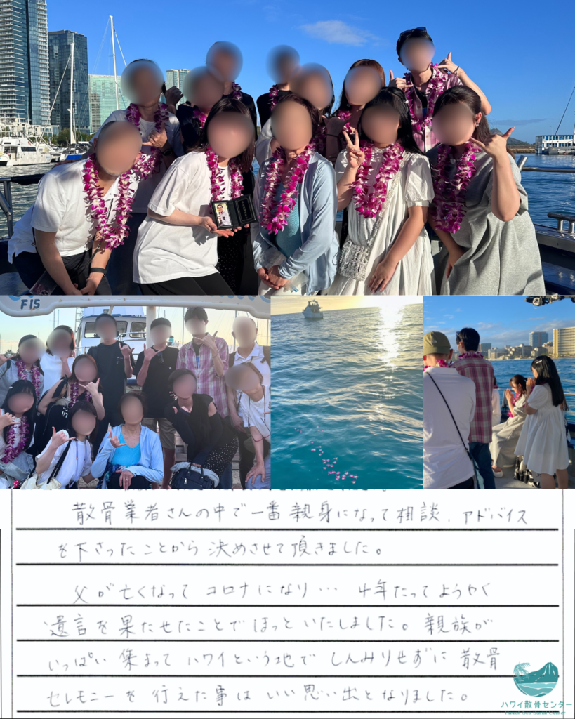 親族がいっぱい集まってハワイという地で、しんみりせずに散骨セレモニーを行えた事はいい思い出となりました。