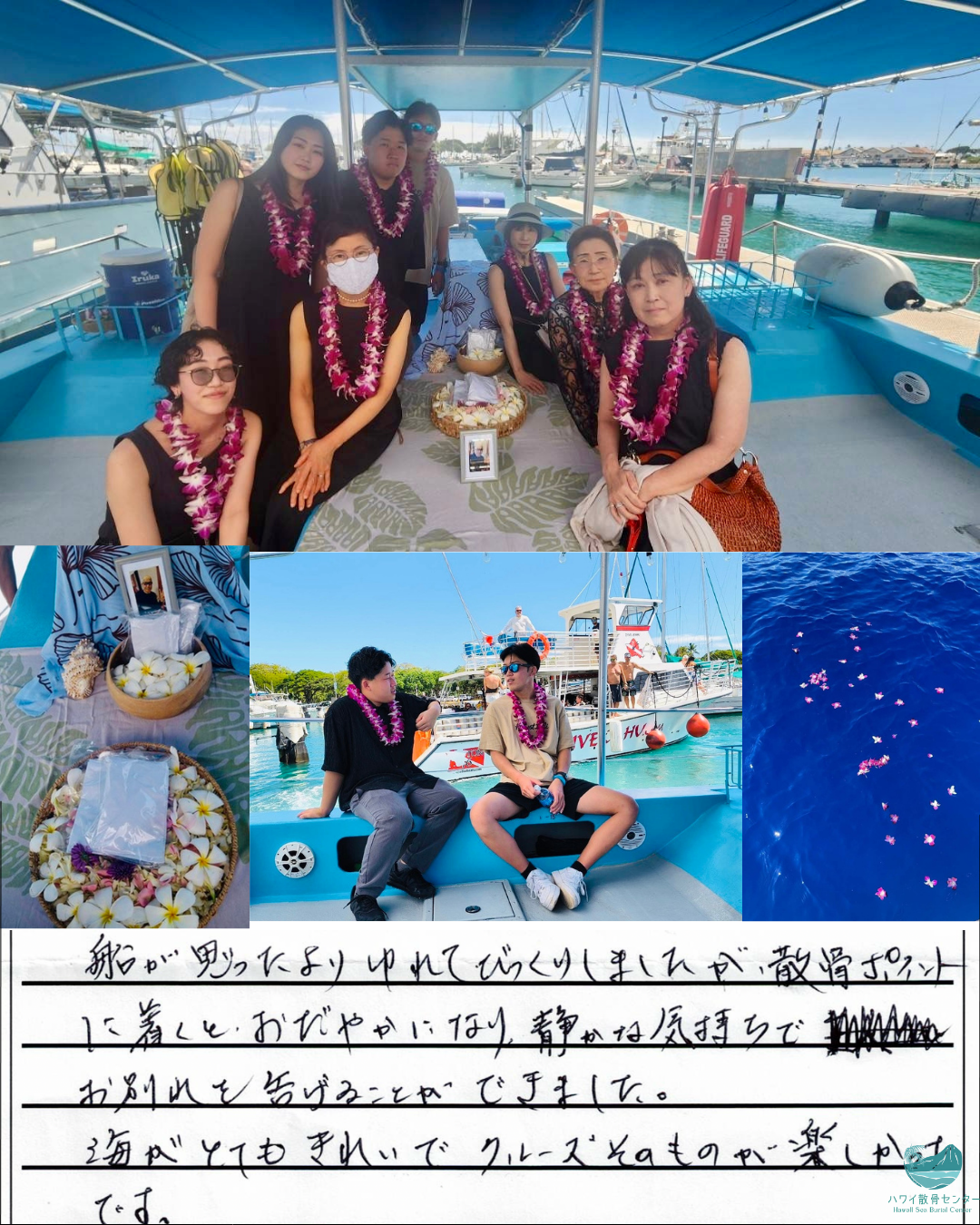 船が思ったよりゆれてびっくりしましたが、散骨ポイントに着くとおだやかになり、静かな気持ちでお別れを告げることができました。