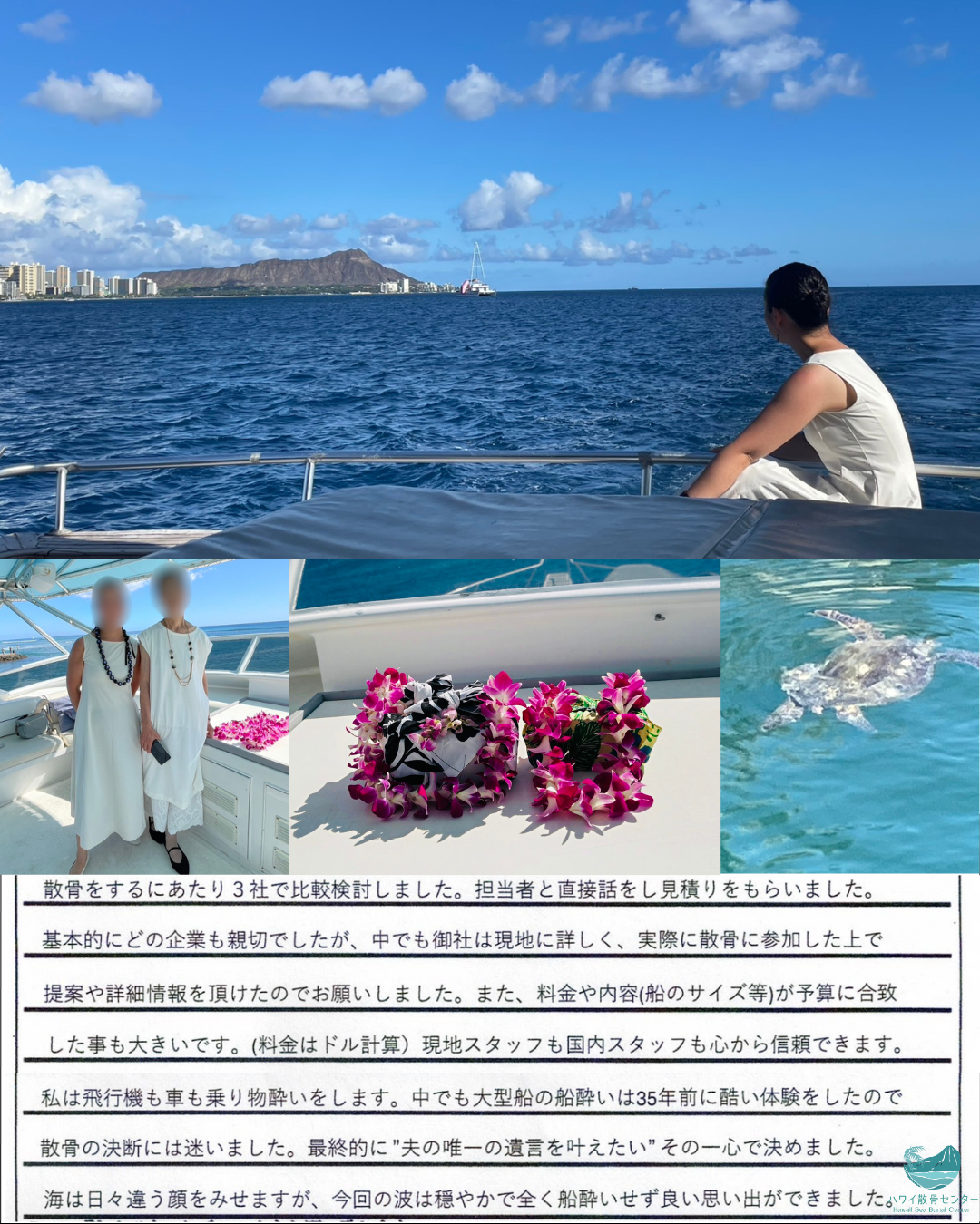 どの企業も親切でしたが、中でも御社は現地に詳しく、実際に散骨に参加した上での提案や詳細情報を頂けたのでお願いしました。現地スタッフも国内スタッフも心から信頼できます。